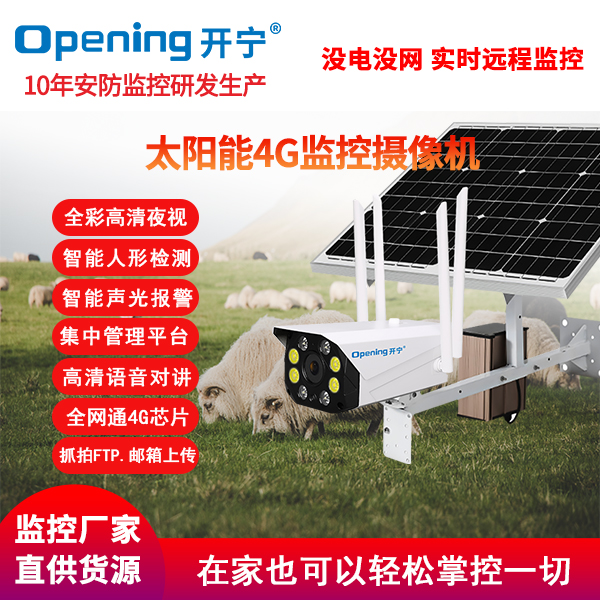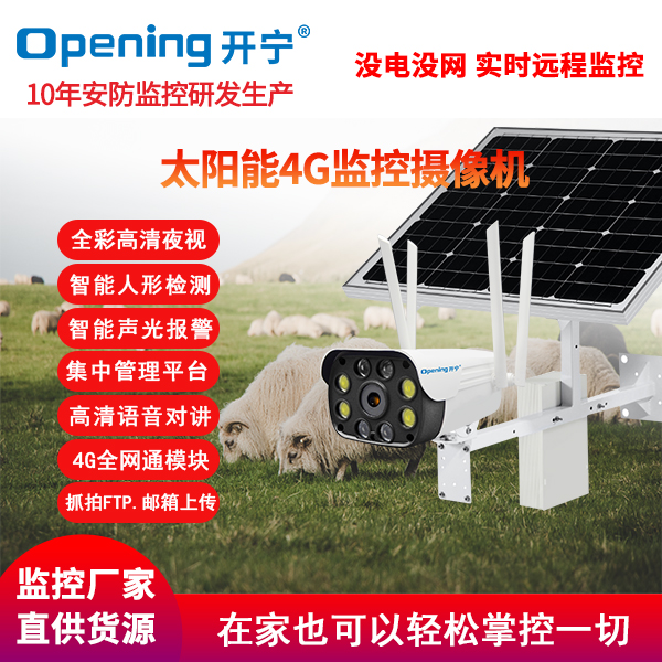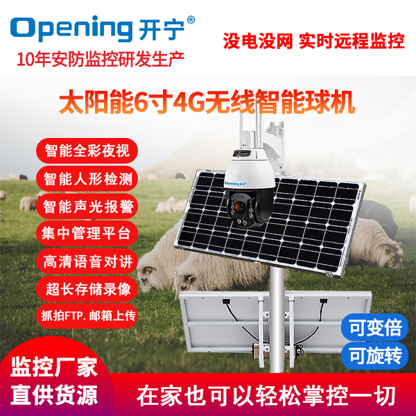 采用開寧7寸4G無線智能30倍光學(xué)變焦球機(jī)+開寧太陽能供電系統(tǒng)(含太陽能板和電池,有不同的規(guī)格選擇)組成太陽能4G監(jiān)控系統(tǒng);監(jiān)控專用高清自動變焦30倍光學(xué)變焦鏡頭,監(jiān)控專用高清自動變焦鏡頭,4g無線球機(jī)水平旋轉(zhuǎn):0°~360°,垂直旋轉(zhuǎn):0°~90°;6顆大功率點(diǎn)陣紅外燈,6顆大功率遠(yuǎn)距離白光燈,夜視距離80-150米;7寸30倍變焦球機(jī),水平360°連續(xù)旋轉(zhuǎn),無監(jiān)視盲區(qū);支持預(yù)置位和巡航;移動偵測報(bào)警 Email報(bào)警,F(xiàn)TP圖片上傳,手機(jī)推送;