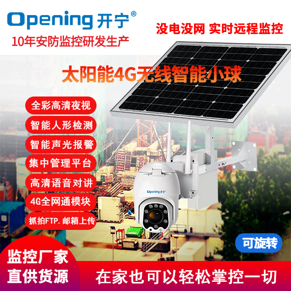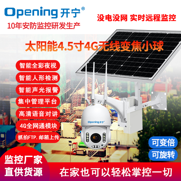 采用開寧7寸4G無線智能30倍光學(xué)變焦球機(jī)+開寧太陽能供電系統(tǒng)(含太陽能板和電池,有不同的規(guī)格選擇)組成太陽能4G監(jiān)控系統(tǒng);監(jiān)控專用高清自動變焦30倍光學(xué)變焦鏡頭,監(jiān)控專用高清自動變焦鏡頭,4g無線球機(jī)水平旋轉(zhuǎn):0°~360°,垂直旋轉(zhuǎn):0°~90°;6顆大功率點(diǎn)陣紅外燈,6顆大功率遠(yuǎn)距離白光燈,夜視距離80-150米;7寸30倍變焦球機(jī),水平360°連續(xù)旋轉(zhuǎn),無監(jiān)視盲區(qū);支持預(yù)置位和巡航;移動偵測報(bào)警 Email報(bào)警,F(xiàn)TP圖片上傳,手機(jī)推送;