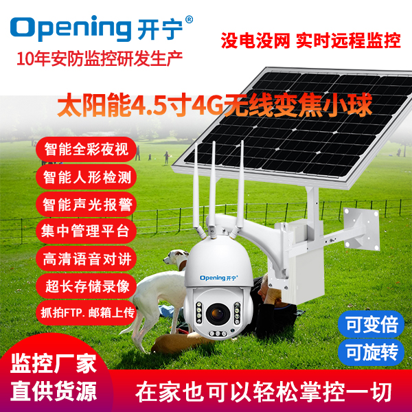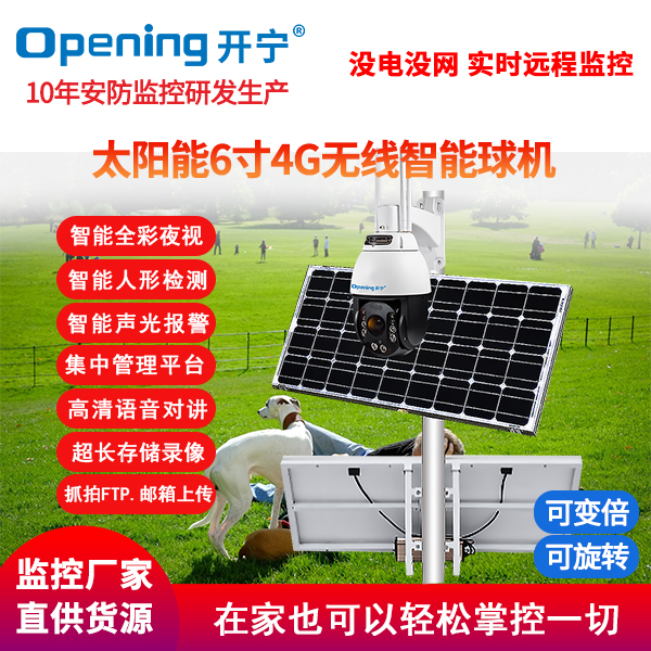 開寧太陽能4G戶外監(jiān)控直播慢直播解決方案,采用太陽能供電系統(tǒng)搭配4G監(jiān)控直播慢直播攝像頭,一套太陽能供電系統(tǒng)+一臺開寧4G監(jiān)控直播慢直播攝像機(jī)即是一套完整的監(jiān)控直播慢直播系統(tǒng)!安裝簡單,無需布線,隨時隨地遠(yuǎn)程監(jiān)控,發(fā)現(xiàn)異常立即觸發(fā)報警!