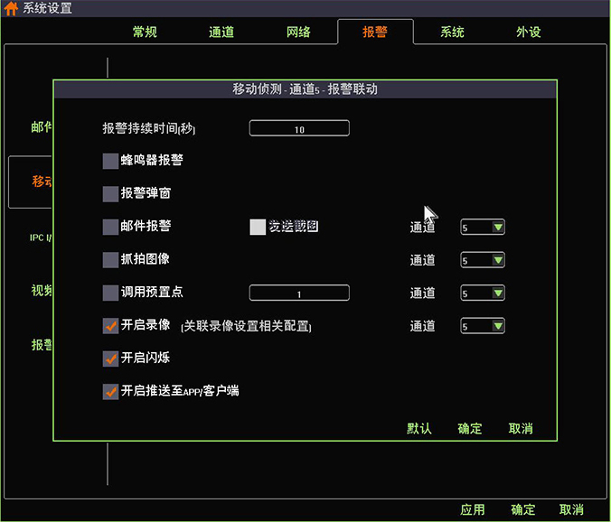 2.鼠標(biāo)移動到系統(tǒng)設(shè)置界面中的“報(bào)警-移動偵測”選項(xiàng),則系統(tǒng)打開硬盤錄像機(jī)移動偵測的界面,并單擊選中任意通道的“啟用”選項(xiàng),分別配置好布防時(shí)間、移動偵測區(qū)域以及移動偵測報(bào)警聯(lián)動項(xiàng),即可開啟該通道的移動檢測功能。(硬盤錄像機(jī)的移動偵測報(bào)警聯(lián)動功能可根據(jù)需要進(jìn)行設(shè)置)如下圖所示: