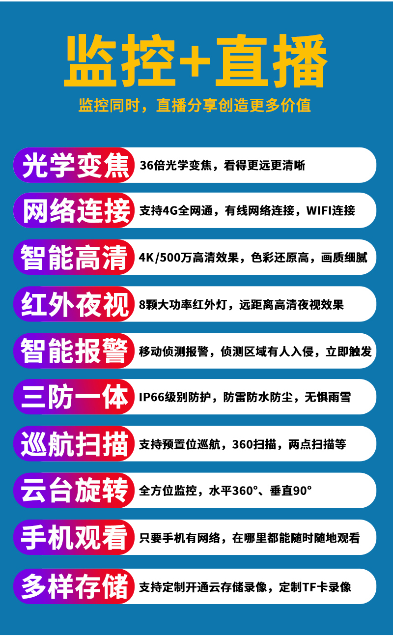- 1、300萬(wàn)/500萬(wàn)/800萬(wàn)4.5寸4G36倍監(jiān)控直播智能球機(jī),一個(gè)球機(jī)就是一套監(jiān)控直播系統(tǒng);支持360度旋轉(zhuǎn),36倍光學(xué)變焦,半金屬外觀,IP66防水等級(jí);
