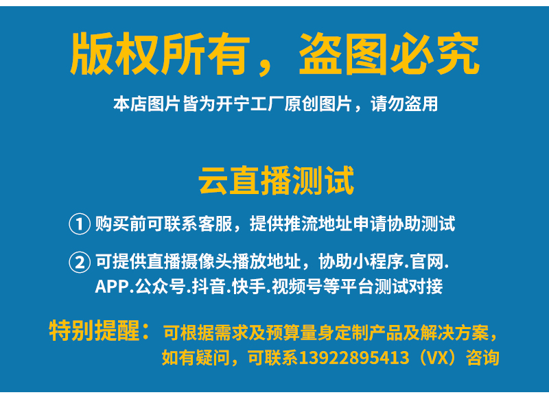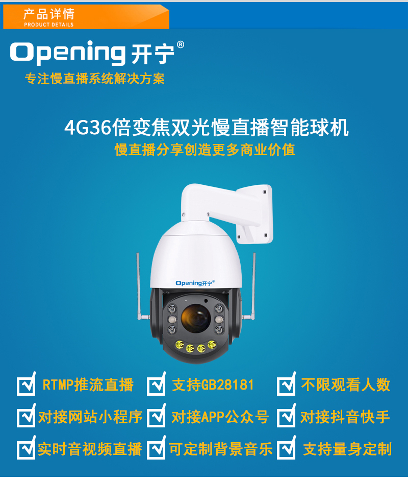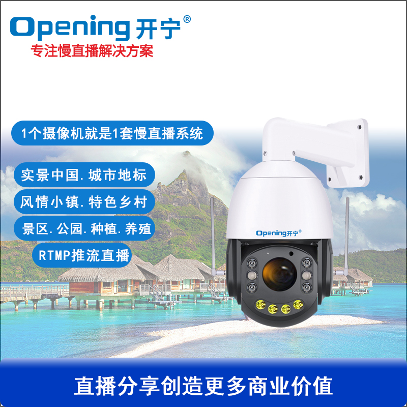 - 1、4G500萬/4K800萬4.5寸36倍雙光慢直播智能球機,一個球機就是一套慢直播系統(tǒng);支持360度旋轉(zhuǎn),36倍光學(xué)變焦,半金屬外觀,IP66防水等級; 2、內(nèi)置智能4G模塊,沒有寬帶網(wǎng)絡(luò)的地方也能實現(xiàn)實時慢直播; 3、不僅可以監(jiān)控監(jiān)管錄像,還可以實時慢直播分享創(chuàng)造更多商業(yè)價值; 4、美景中國.智慧景區(qū).城市慢直播.動物慢直播.融媒體慢直播.央視頻慢直播.戶外直播等慢直播; 5、無需下載安裝APP,簡單實用;不限觀看人數(shù),創(chuàng)造更多商業(yè)價值; 6、RTMP推流直播高清攝像頭;可生成慢直播二維碼,只需掃碼即可觀看慢直播; 7、可接入網(wǎng)站.公眾號.小程序.APP;可對接抖音.快手.視頻號.淘寶.拼多多等平臺; 8、支持GB28181協(xié)議;可接公安.食品.工地.生產(chǎn).教育.畜牧.旅游等監(jiān)管部門平臺; 9、支持4G/WiFi/有線連接,沒有寬帶網(wǎng)絡(luò)用4G流量,有寬帶網(wǎng)絡(luò)可用wifi/網(wǎng)線連接; 10、6顆高效能點陣紅外燈,4顆高效能點陣白光燈,夜視5-100米;36倍變焦高清鏡頭; 11、內(nèi)置高清保真拾音器,聲音視頻同步慢直播;DC12V供電; 12、免費提供集中管理平臺,可實現(xiàn)集中管理慢直播攝像頭,有效提高工作效率; 13、慢直播首選4K800萬高清智能球機,美景中國、實景中國慢直播好幫手! 14、水平360度無限位旋轉(zhuǎn),垂直90度;水平轉(zhuǎn)速40度/秒,垂直轉(zhuǎn)速30度/秒;支持256個預(yù)置位 8組巡航8組掃描,支持水平掃描,2點區(qū)域掃描,隨機掃描;