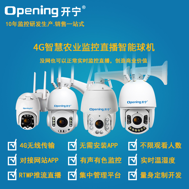 - 1、4G智慧農(nóng)業(yè)直播監(jiān)控球機(jī),一個(gè)球機(jī)就是一套監(jiān)控直播系統(tǒng);支持360度旋轉(zhuǎn),支持預(yù)置點(diǎn)和巡航,30倍光學(xué)變焦,IP66防水等級(jí);可接溫濕度傳感器;