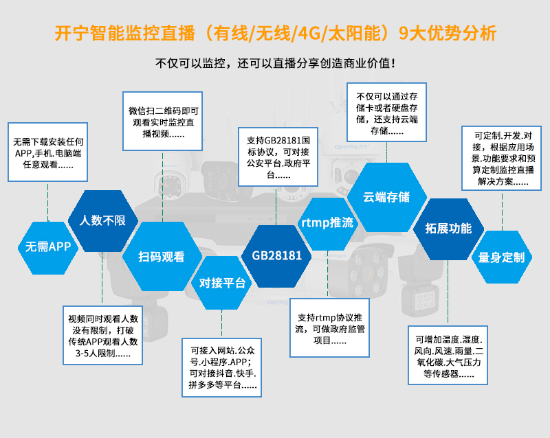 4、可接入網(wǎng)站.公眾號.小程序.APP;支持GB28181協(xié)議;可接公安.食品.工地.生產(chǎn).教育.畜牧.旅游等監(jiān)管部門平臺;