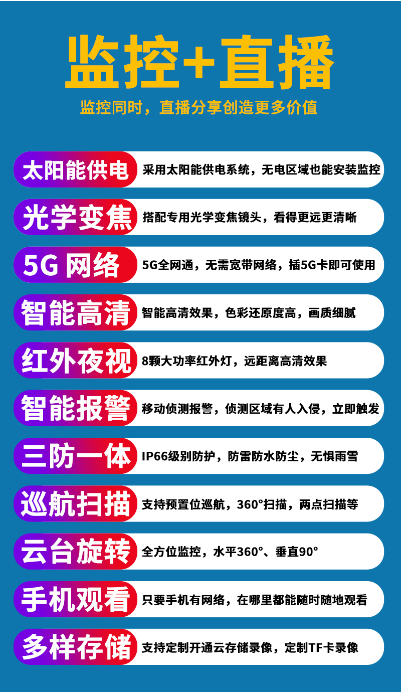 2、內(nèi)置智能5G模塊,沒有寬帶網(wǎng)絡(luò)的地方也能實(shí)現(xiàn)實(shí)時(shí)監(jiān)控直播;另外選配太陽能供電系統(tǒng)可實(shí)現(xiàn)無電無網(wǎng)實(shí)時(shí)監(jiān)控直播;