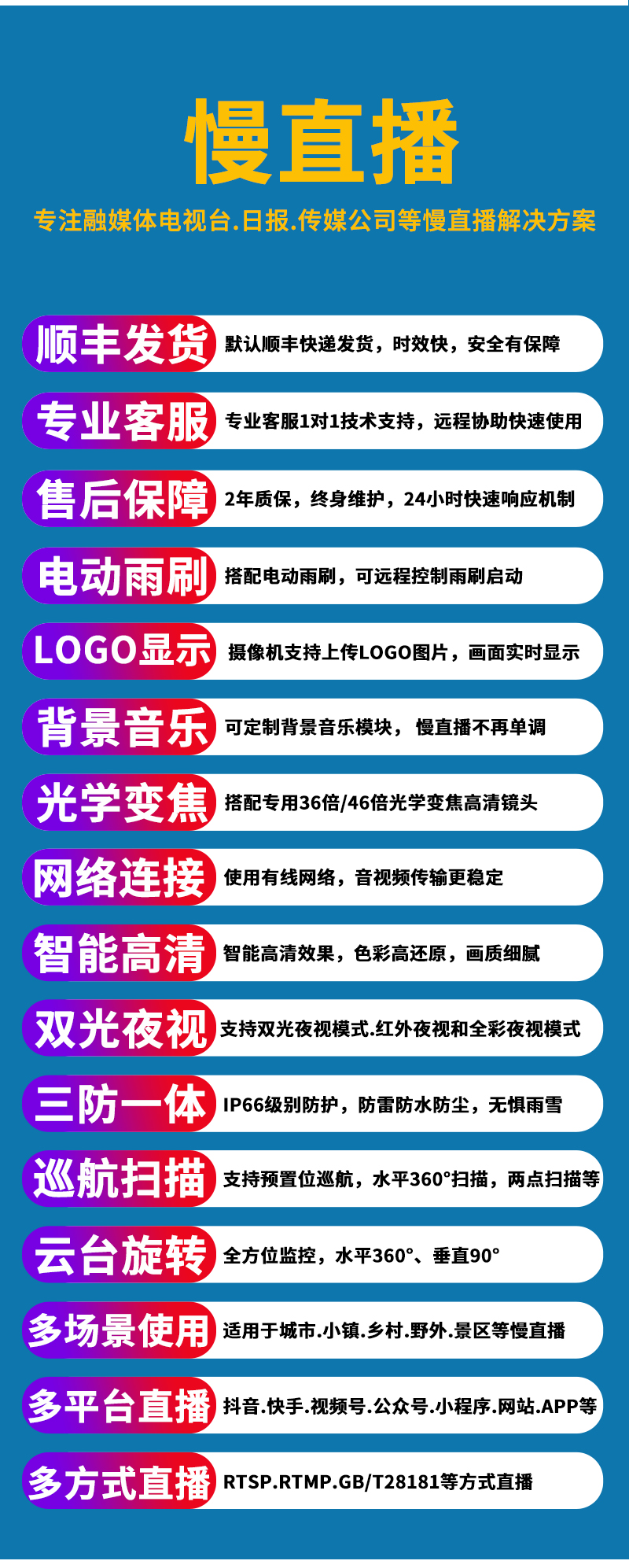 - 1、400萬/500萬/4K800萬4.5寸36倍雙光慢直播智能高清球機(jī),一個球機(jī)就是一套慢直播系統(tǒng);支持360度旋轉(zhuǎn),支持預(yù)置點和巡航,36倍光學(xué)變焦,半金屬外觀,電動雨刷,IP66防水等級;