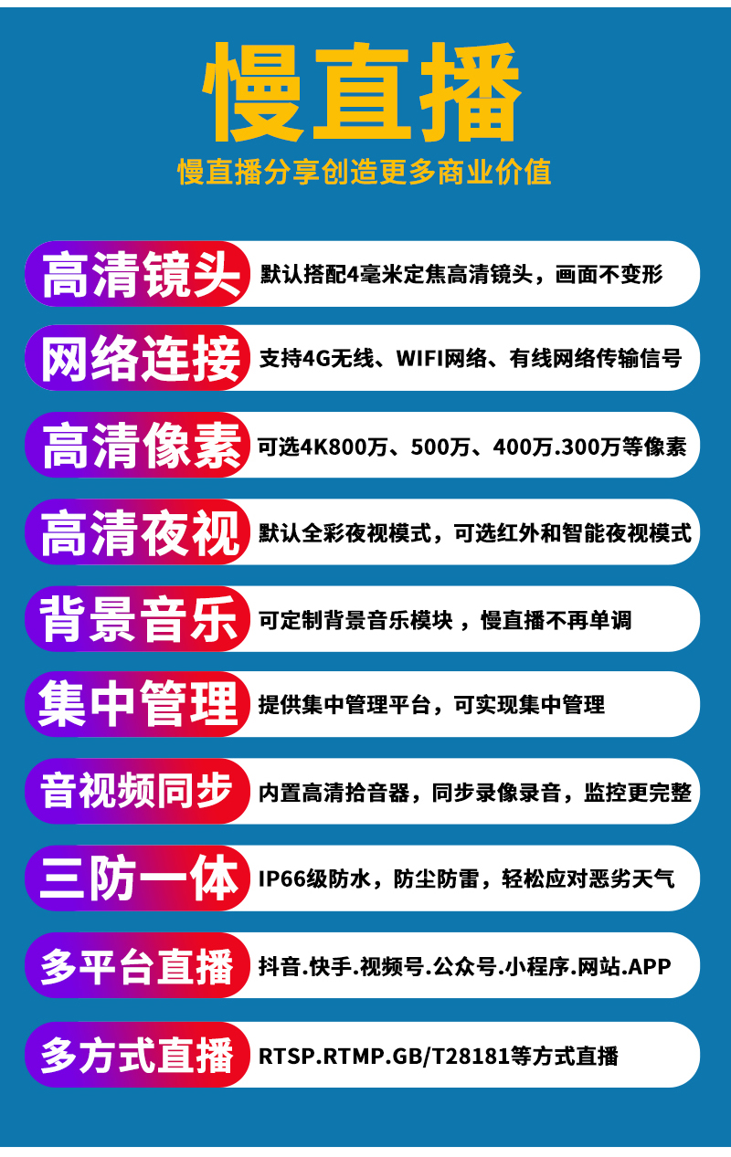 - 1、4G300萬(wàn)/500萬(wàn)/4K800萬(wàn)/1200萬(wàn)全彩高清無(wú)畸變慢直播智能攝像機(jī),一個(gè)攝像機(jī)就是一套慢直播系統(tǒng);