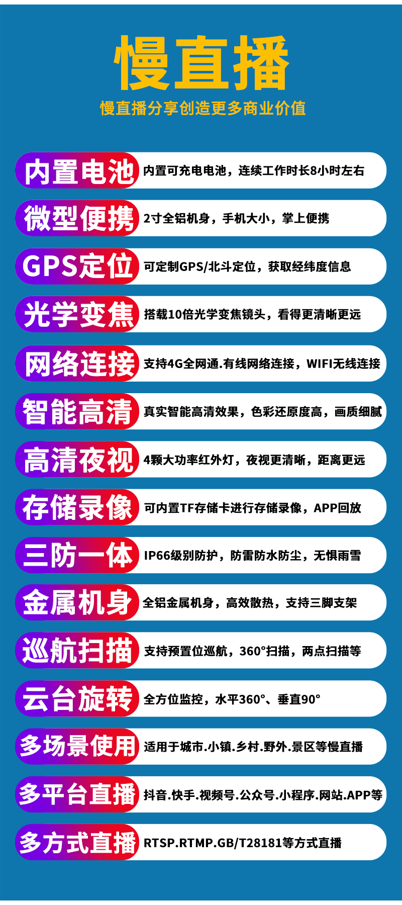- 1、400萬/500萬/800萬4G紅外慢直播智能高清小型布控球,一個布控球就是一套完整的慢直播系統(tǒng);支持360度水平及90度垂直旋轉(zhuǎn),10倍光學(xué)變焦高清鏡頭,全金屬外觀,IP66防水等級;內(nèi)置大容量鋰電池,連續(xù)工作時長8小時左右;配置便攜式牢固金屬三腳架;可滿足臨時快速搭建慢直播系統(tǒng)搭建需求;