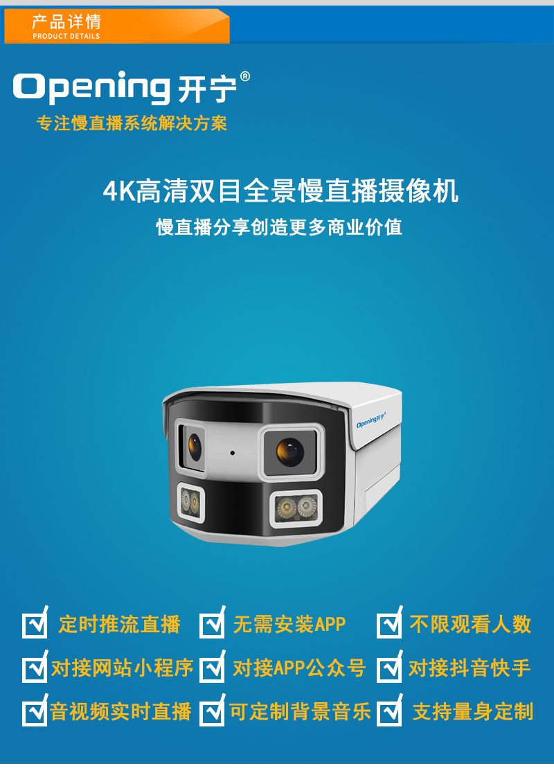 - 1、800萬雙目拼接雙光槍式慢直播攝像機,1個攝像機就是一套慢直播系統(tǒng);雙目拼接180度超廣角;