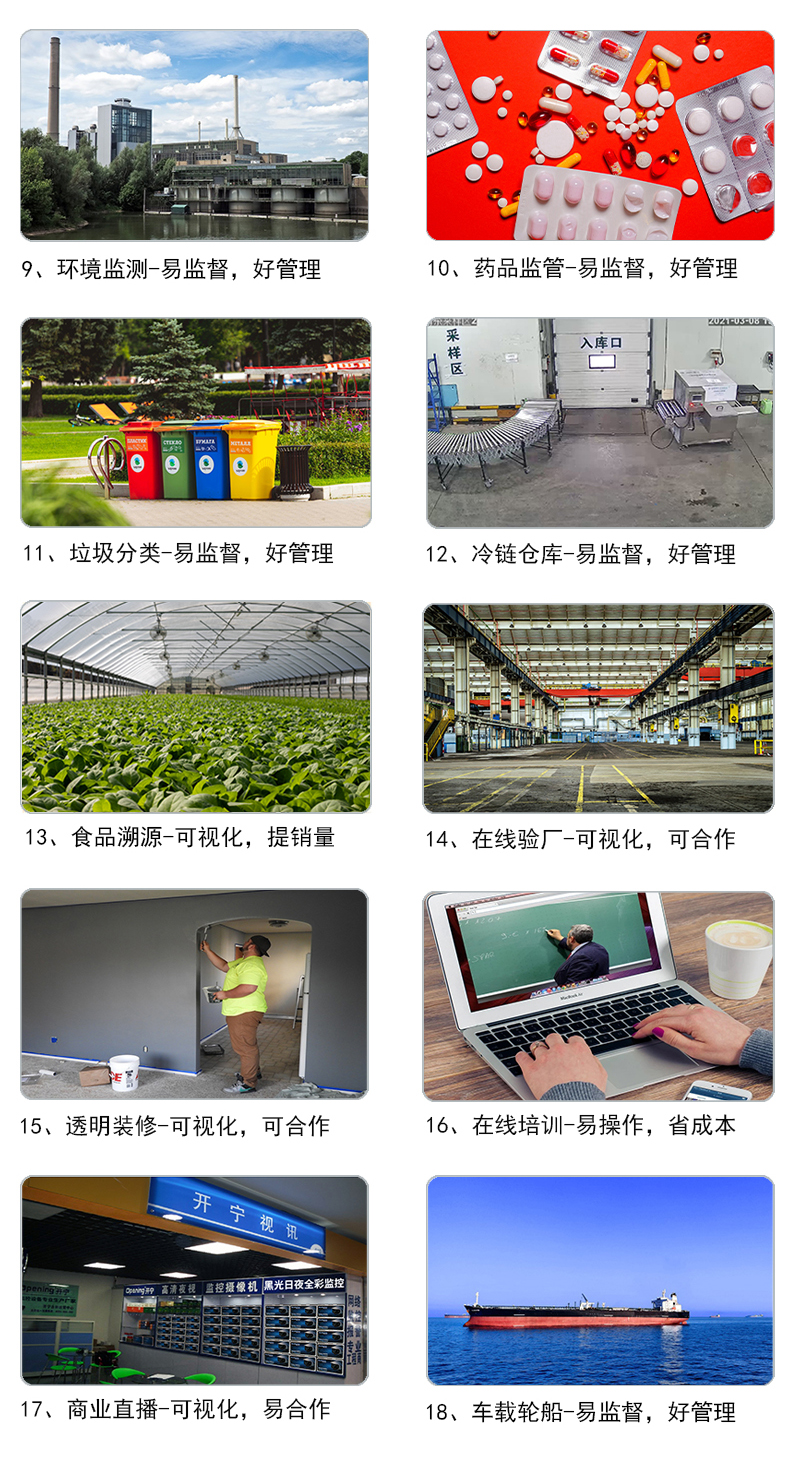 4、明廚亮灶.透明裝修.智慧農(nóng)業(yè).食品溯源.實景中國.在線驗廠.店鋪直播.展會直播等實時監(jiān)控直播;